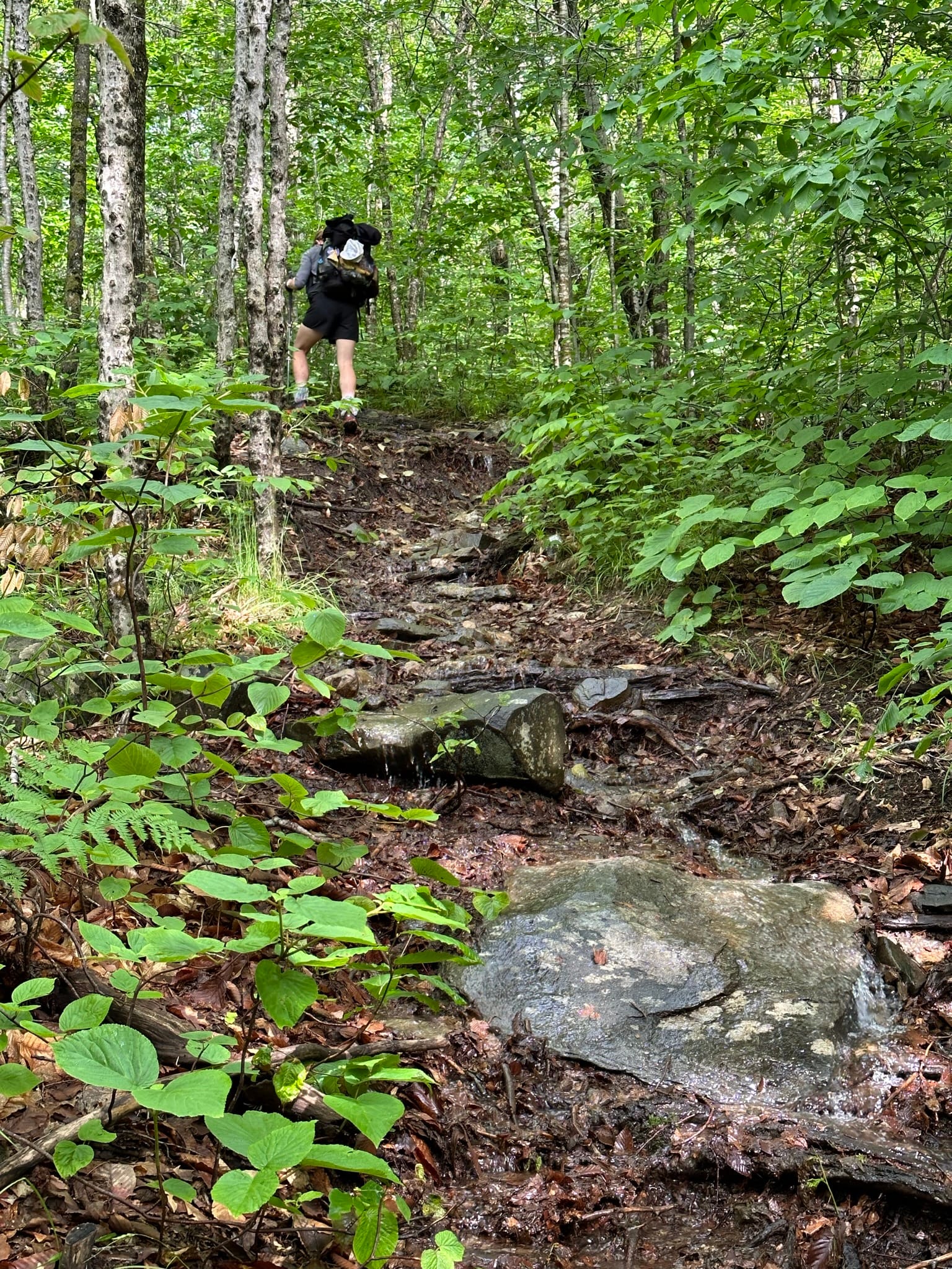Last night was fairly sleepless as it kept cycling between quiet shelter to heavy rain and hail hammering the tin roof. At some point, though, I passed out for a while until I woke up around 5 am to more rain and people packing up. Begrudgingly, Instigator and I packed up, and when the rain stopped, we headed out. The trail for the first few miles was composed mainly of slabs of granite and thick roots, so it was incredibly slippery. Thankfully, the rain finally broke, and to our delight, the little orange newts had popped up everywhere! It then sprinkled on and off until around noon when the sun broke through the clouds. From then on, it was pretty easy cruising, and I even got to pet a cow at a farm we passed! As the miles wore on (because we had to do extra because of the weather), we started to really feel our injuries kicking in. Thankfully, a little past 6 pm, we rolled into the Upper Goose Pond Cabin and managed to snag the two last available bunks for the night. We were both beat from our long day and fairly sleepless night, so it was straight to bed after dinner!