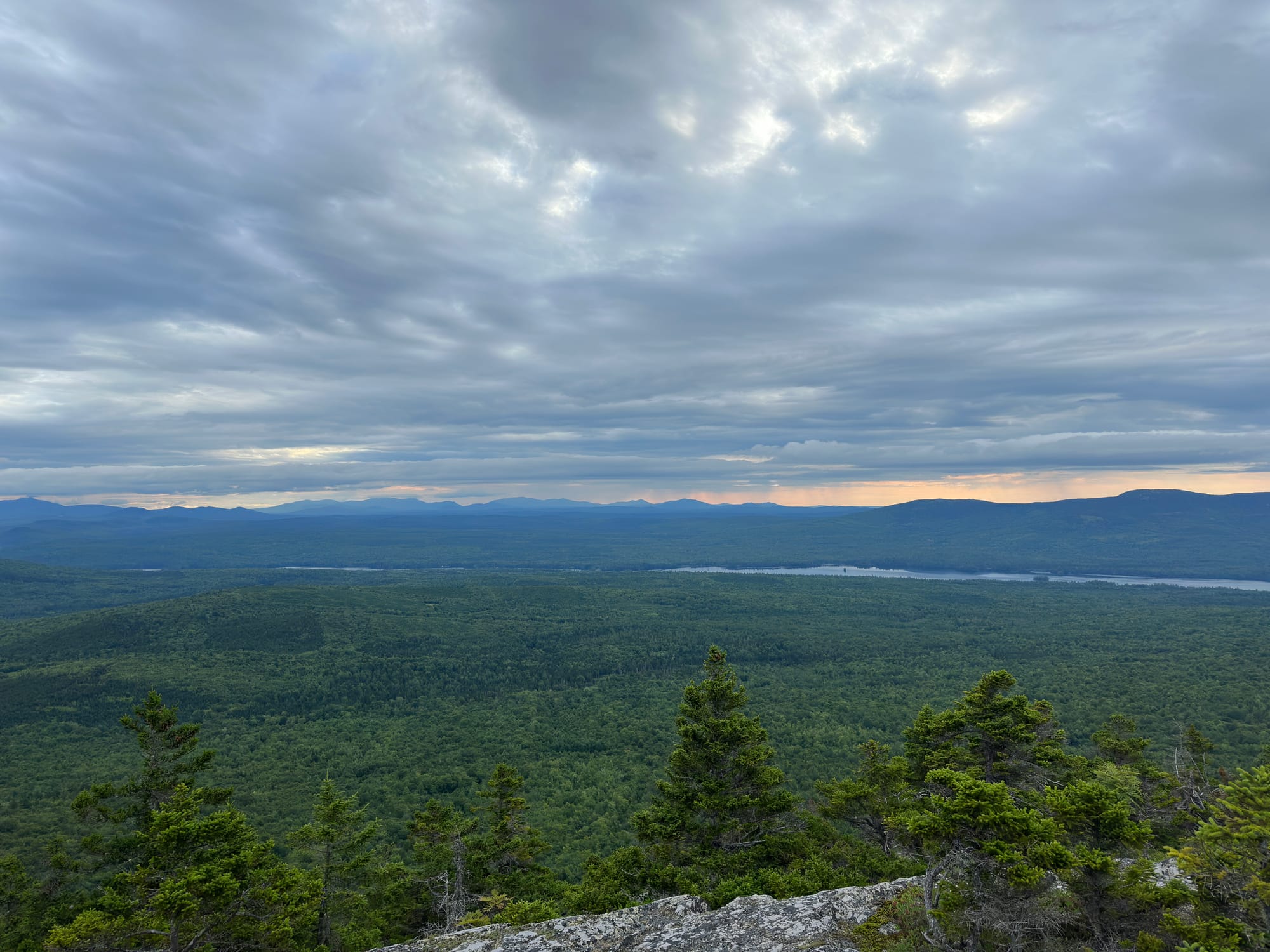 After our easy day yesterday, we woke up a bit earlier to knock out some mileage before a storm was forecast to roll through. Leaving the Lean-to’s camping area was a bit tricky due to all of the mud and a group of Girl Scouts who had set up their tents along the walkway. We made it up Pleasant Pond Mountain in no time, and we were rewarded with gorgeous sweeping views of Maine and a sky that was quickly darkening earlier than expected. In an attempt not to get stuck out in the storm, we flew up and over Middle Mountain and jogged to try and get to Bald Mountain Lean-to with thunder and lightning booming around us. About a mile or so out, the storm caught up to us, and we were smacked with a wall of heavy rain and strong wind. We kept moving, though, and made it to the shelter, completely drenched. As the storm raged on, a band of ragged sobo hikers rolled in who had been caught in the storm on top of Moxie Bald Mountain, and then another nobo hiker jogged in. We all snacked as we dried off, and it turned out that the nobo, Wilder, was friends with Mountain Goat, a hiker I had hung out with back at the Notch Hostel in New Hampshire. While waiting out the storm, Widler shared his plan to be in Monson by early tomorrow morning and how he would take the old AT, a logging road that ran next to a river, into town instead of the current trail to avoid the numerous river crossings.