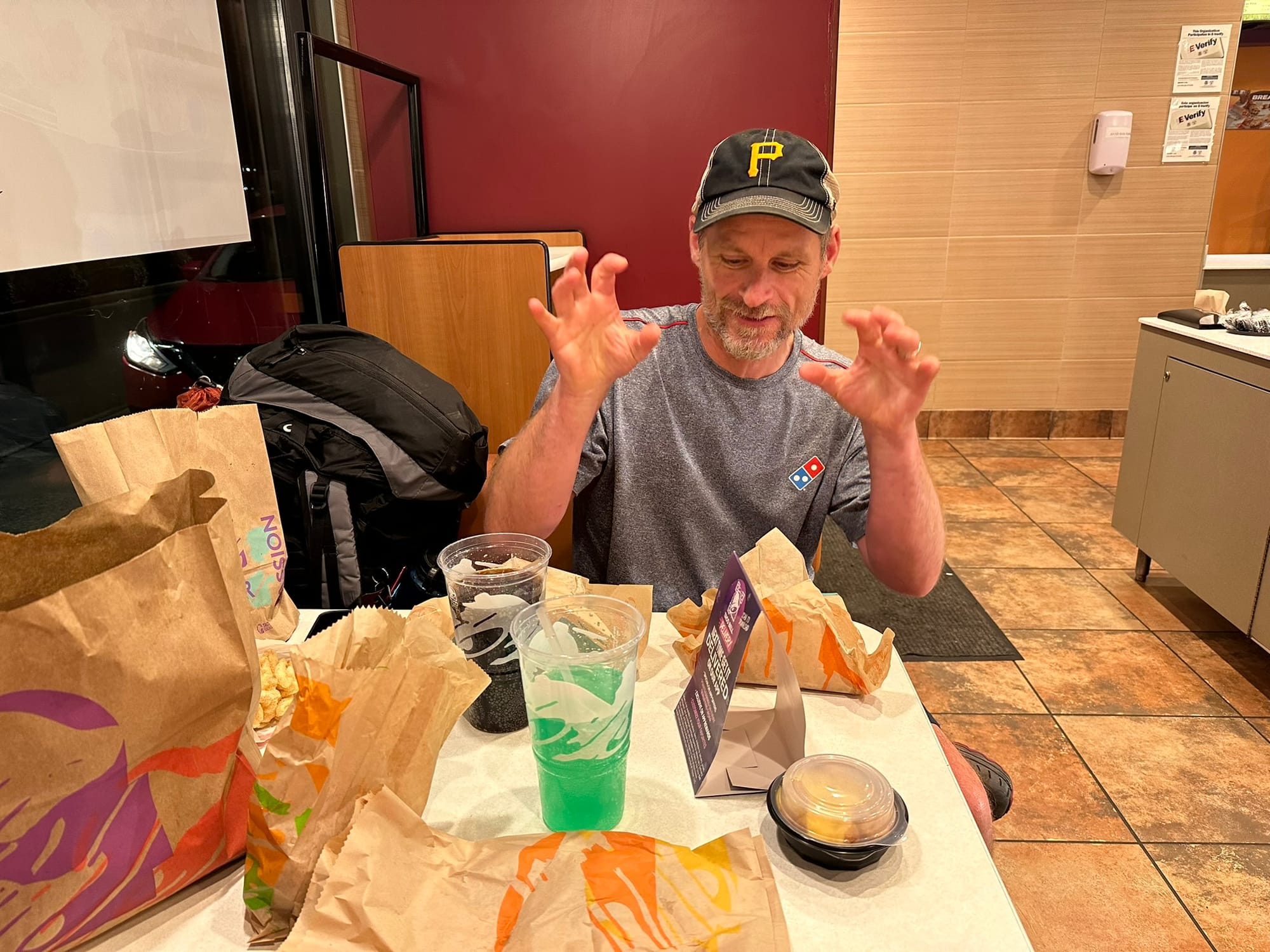 We started the day at Hogback Ridge shelter, where we were awoken with warm sunlight after a cool, misty morning. With the promise of trail magic, which we were informed of by another hiker, the Alchemist and I quickly packed up and flew down the ridge line, where we had freshly made breakfast tacos. We also ran into Taylor again, who had at some point passed us. We then proceeded to play leapfrog with her as we each took turns, taking breaks and passing each other throughout the day. The 3 of us eventually stopped to have lunch together on top of Big Bald, where we soaked in the views and the sunlight after the chilly morning. After that, we continued to leapfrog again until the No Business Knob Shelter, where we had dinner together. It was there that the Alchemist and I made the call to walk into Erwin that night instead of waiting until the next day. After an incredible descent down to Uncle Johnny’s, we were informed that there were no more bunks available. So we made a reservation at a nearby hotel, and then tried (and failed) to find a ride. After an hour of calling shuttles and messing with Uber, we made the call to just walk the 4 miles into town, which pushed our total daily mileage to over 30 miles! To get there, we had to traverse the “Erwin Linear Trail'' which slowly wound its way through the industrial park and water treatment plant… Once we FINALLY arrived, we celebrated with large orders at Taco Bell before finally passing out at our hotel.