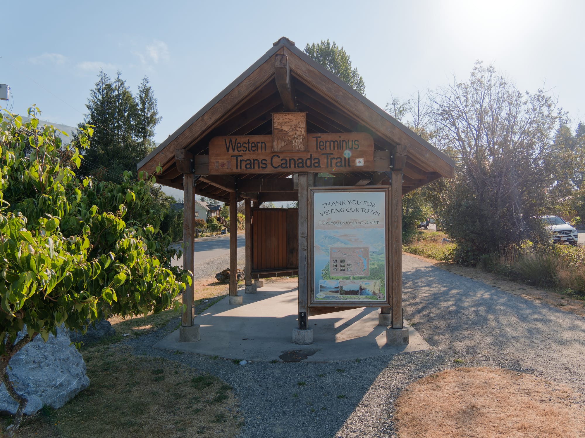 Day 2 started slowly after my night spent sleeping on the ground. To make the most of the morning temperature, I was on the bike by 6 am, with legs stiff as boards. I was dragging, so I decided to slam down extra calories and listen to an audiobook in an effort to find a little speed. I zoned out, and before I knew it, I had arrived in the town of Lake Cowichan, roughly the halfway mark, at around 9:30 am. I was shocked that I had just cranked out 25 miles, even more so when I realized that it had been uphill! I grabbed a much needed Gatorade and some calories from the gas station, and then checked out the Western Terminus of the Trans Canada Trail.