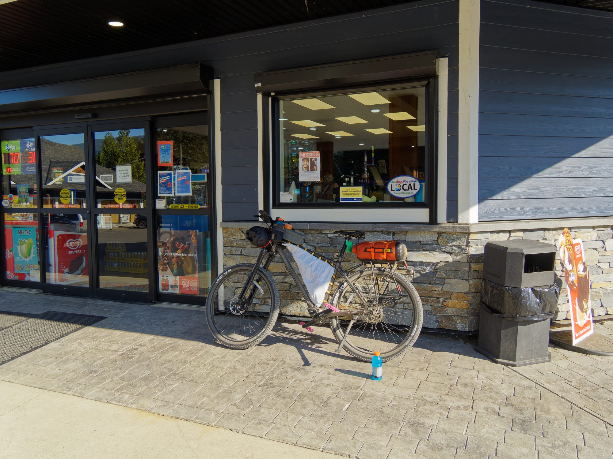 After my long break, I was delighted to find that the northern section of the Cowichan Valley Trail was incredibly smooth and mostly downhill! Riding on a sugar high, I quickly ripped across the top part, again beating my pace goals. I finished the top of the figure 8 before noon, and I passed the Kinsol Trestle Bridge again around 1 pm. I had originally planned to stop for lunch there, but it was swarming with people, and the noon sun meant that all of the tables were unshaded. I could feel myself flagging again, and I needed water, so I stopped off at a random lakeside park next to Lake Shawnigan. While I was stopped and filtering water, some locals informed me that it was a holiday and that there was a McDonald's 5 miles up the road! Rehydrated, I motored on, motivated by the promise of a McDouble.