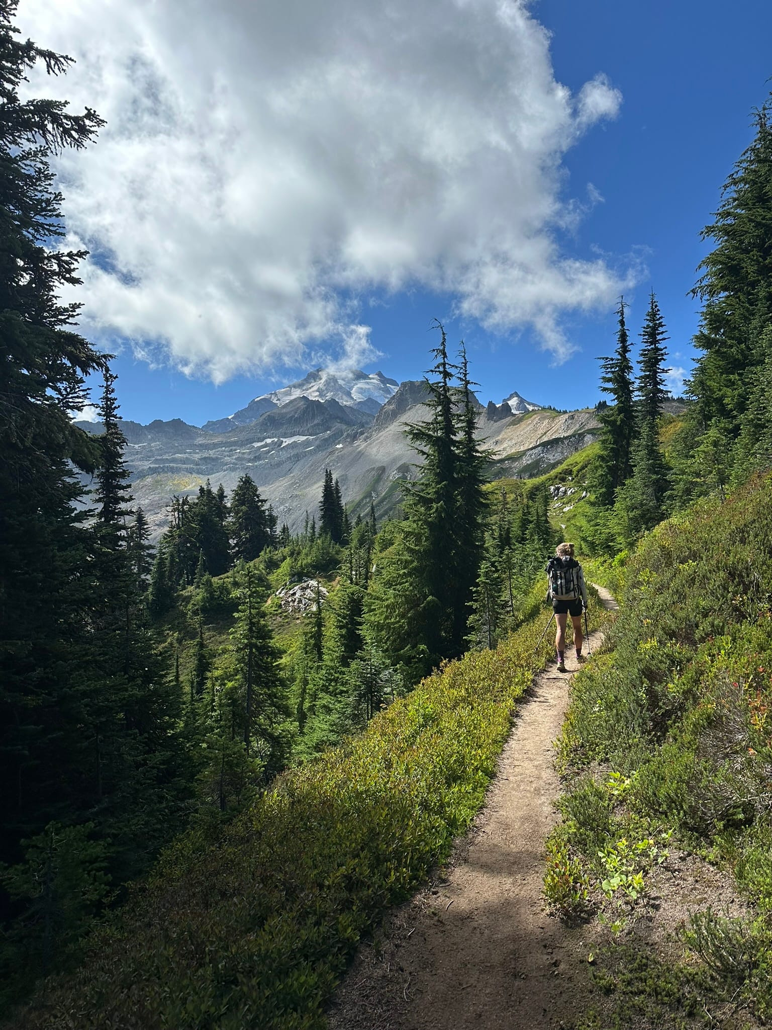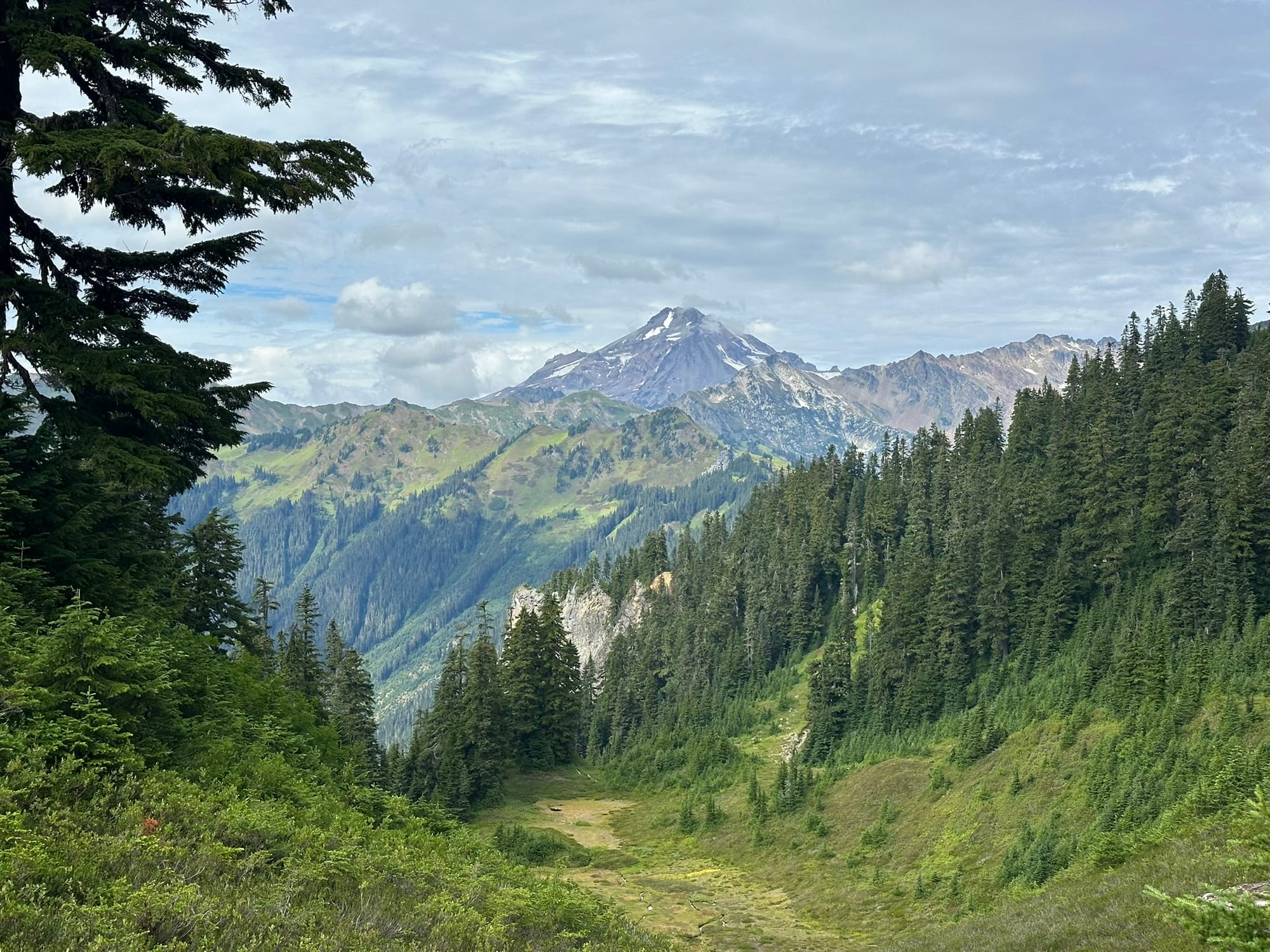 When we finally arrived at the top, I was soaked and exhausted. We had barely done 8 miles, and it was already past 11am. The next two miles almost made the climb worth it as we were rewarded with incredible views of Glacier Peak and the distant North Cascades, all covered in heavy glaciers and wreathed in clouds. We stopped briefly to filter water and watch marmots before we pushed on, eager to make up mileage.