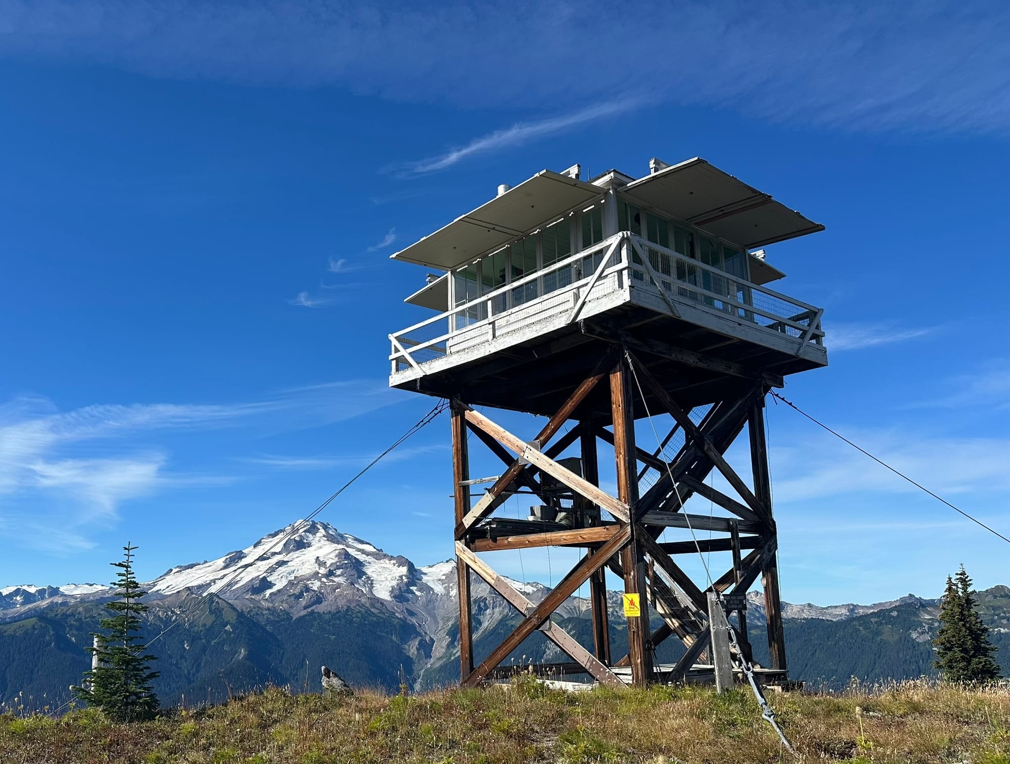 Not long after Anna saw a large black bear ahead of her getting into the huckleberries, but she had ambled off into the woods before I arrived. We continued on rather uneventfully until we finally crested the ridge. From there, we headed west briefly to check out the Miners Ridge Fire Watch Tower and to soak in an amazing view of Glacier Peak and the surrounding North Cascades. Unfortunately, the caretaker was not home, so we couldn’t get a tour, but we still hung out to have a snack. My gut was still giving me trouble, so after our break, we continued slowly east towards Image Lake. The trail was quite exposed, but it was gorgeous. It’s honestly a shame the PCT doesn’t go up here. We saw several massive old marmots in the berry patches and a couple of locals out for a multi-day hike. After Image Lake, we descended to the Miners Ridge Trail and followed it until it rejoined the PCT at mile 2554.2. Along the way, we passed several old tin-roofed shacks built into the cliffside, which I assume were remnants of the aforementioned miners.