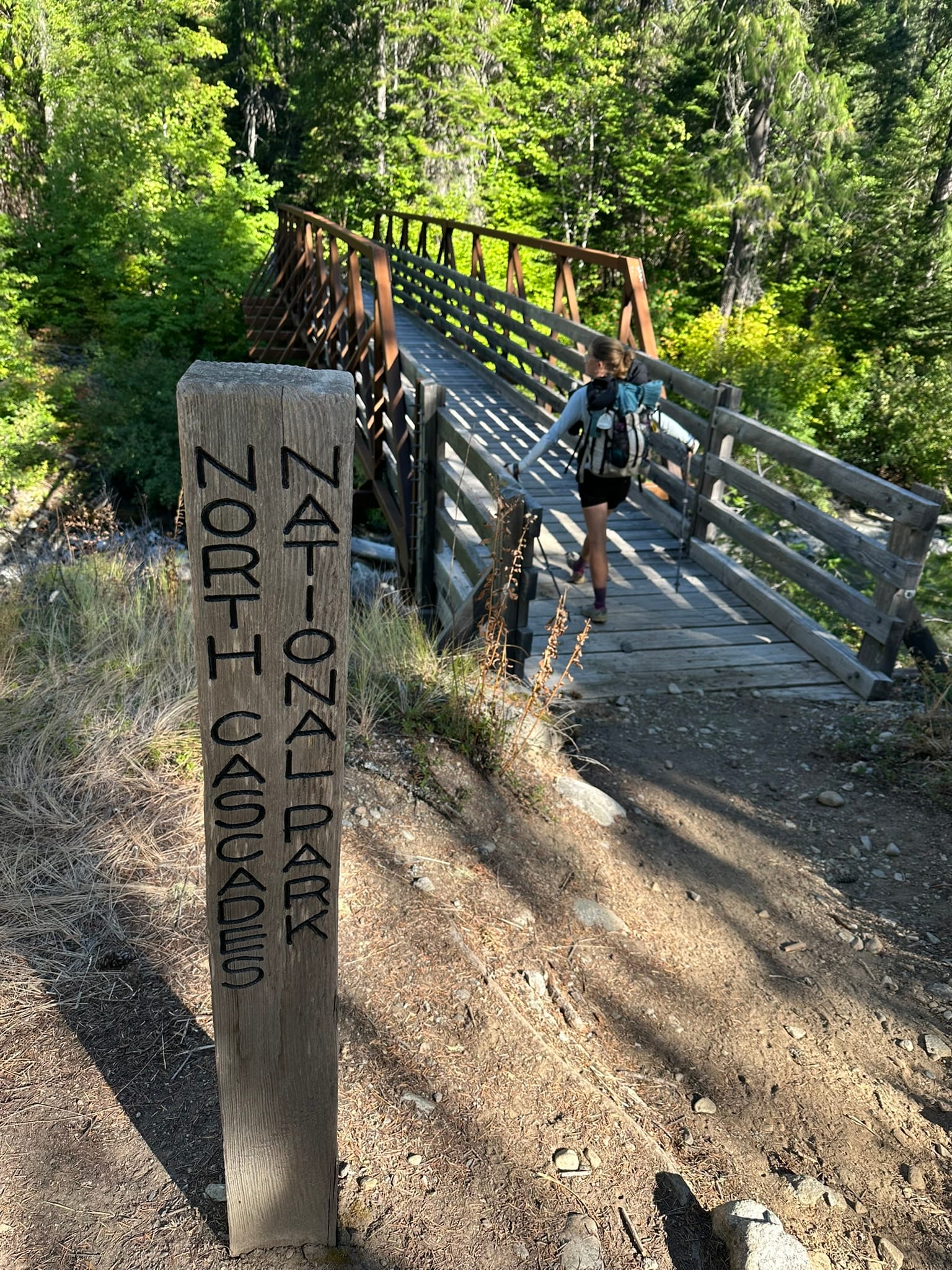I was once again dead tired from my gut issues yesterday, so we slept in, figuring that we wouldn’t make the 9am shuttle without headlamp hiking. The section of trail from our tentsite to the road was incredibly well-maintained and cushy due to the pineduff. As a result, we made excellent time, knocking out the 10 miles in less than 3 hours. Unfortunately, this meant that we arrived at High Bridge Camp at 9:15am, just 15 minutes after the morning bus had come by. Woops. As we crossed the bridge, we officially entered North Cascades National Park, the last national park of the trail! When we walked up to the camp area, we found Bedhead demolishing a cinnamon roll that he had grabbed from the bakery on the way out. He told us that the bus had even been late, so we literally just missed it! We chatted with him for a bit before he hiked on, and then we chatted with the caretaker for a few hours as we waited for the 12:30 bus. While we waited, a few other hikers rolled in that we didn’t know, and then Ben and Emma arrived, so we hung out with them for a while. Since the road only goes into Stehekin, there were no cars to even attempt to hitch with, so we just relaxed for the duration.