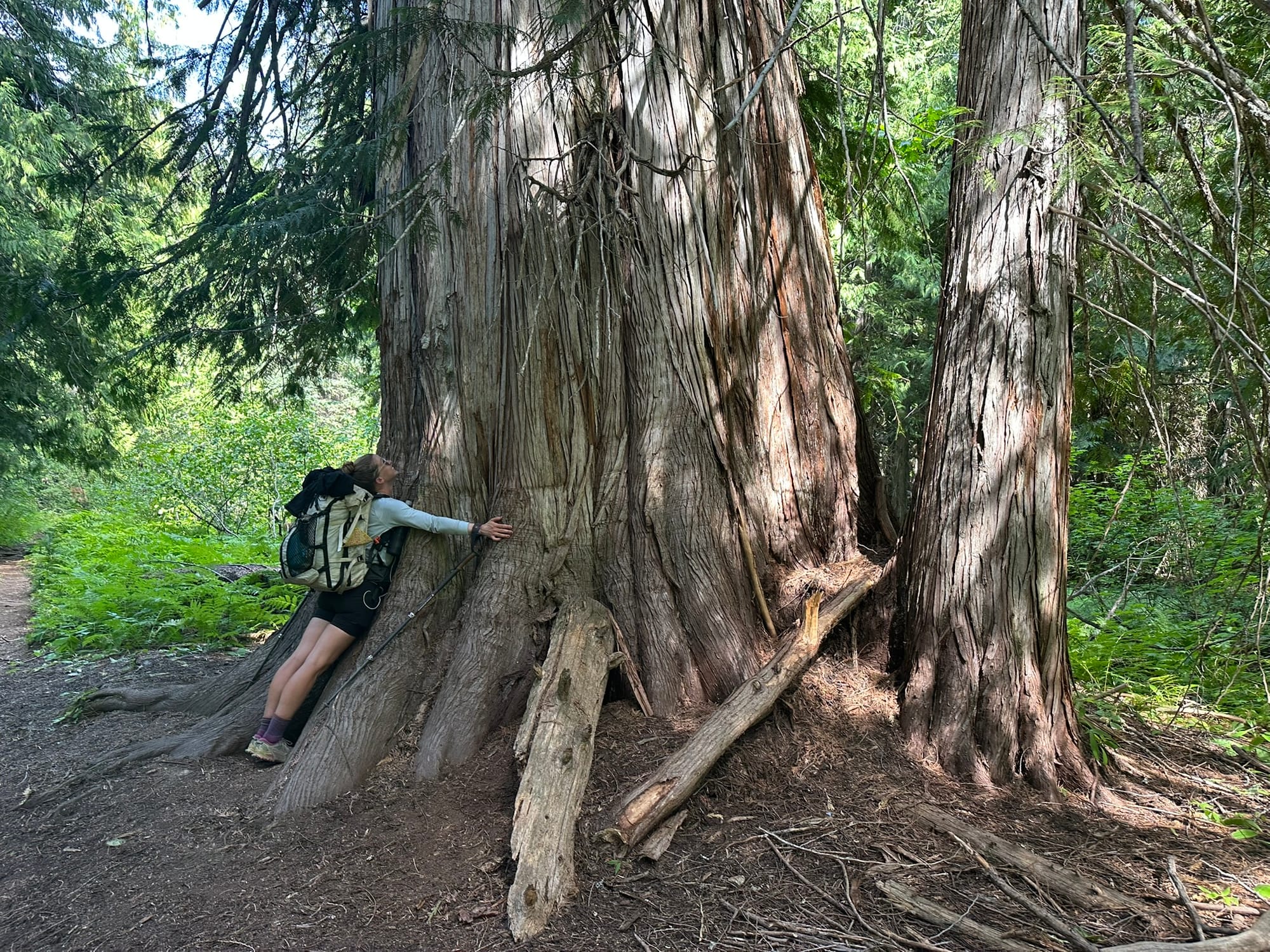 We stopped at the Dolly Vista Trail Camp at mile 2534.7 to have lunch, dry out the tent, and enjoy the view before we headed down. Refueled and slightly refreshed, we headed down 3700ft over 9 miles towards the Suiattle River. Once again, the majority of the downhill was quite steep and full of blowdowns. As we neared the bottom, the trees became much larger (think coastal redwoods and hemlocks) and the blowdowns took more and more time to navigate. Once we passed Vista Creek at mile 2540.7, the blowdowns ended, and we could see signs of recent trail maintenance! Shout out to the BCCC crew for the amazing work!