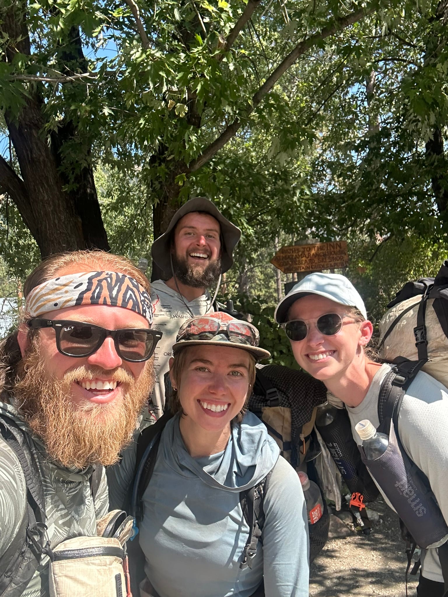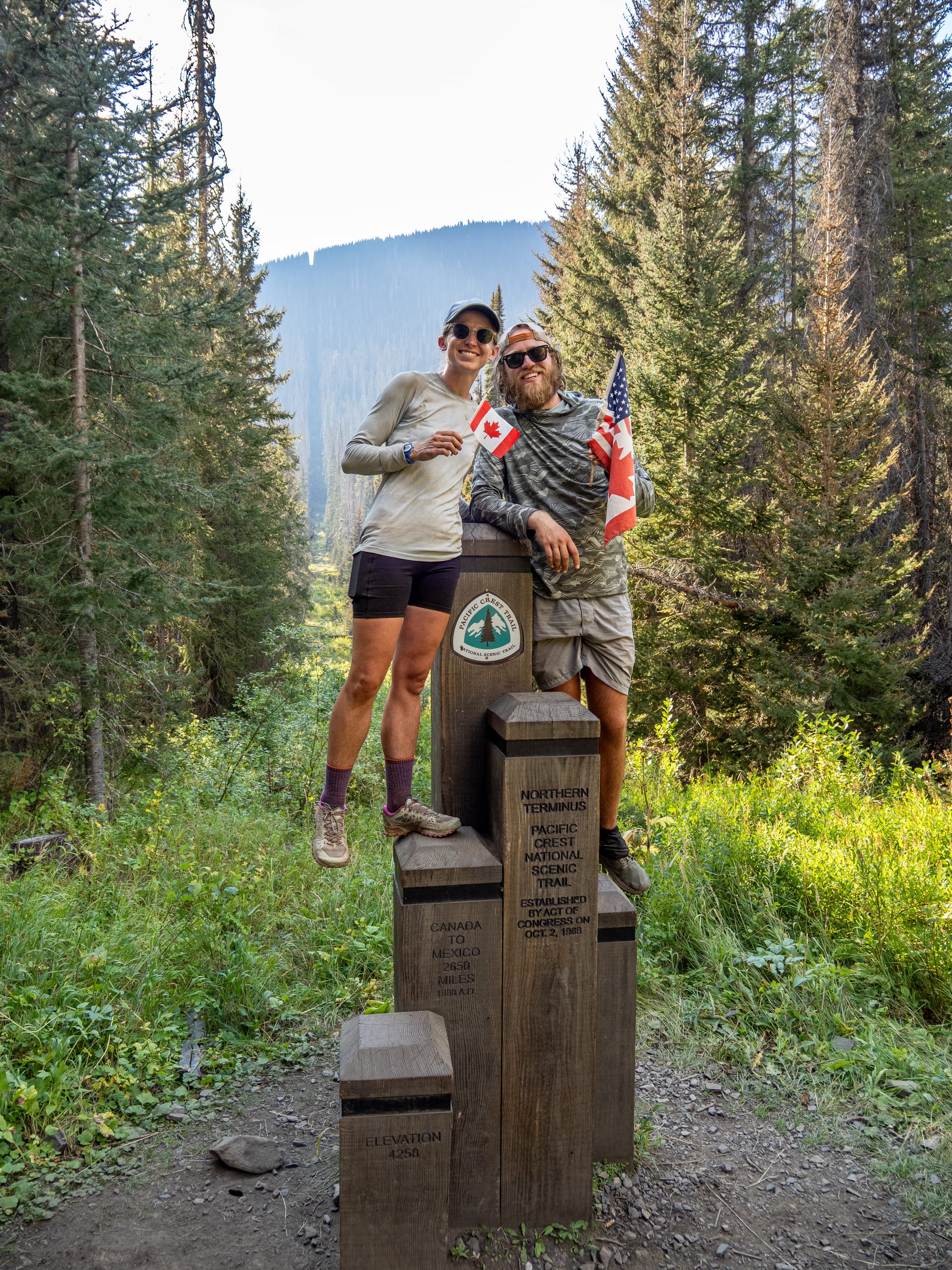 Around 1:30pm, we wrapped up lunch and then began hoofing it, the 6.5 miles and 2000ft down to the terminus. This section of the trail was blissfully cool and shady, so with our light packs, it felt like we were flying downhill. Right around 4pm we arrived to find Mountain Goat and Kira at the terminus waiting for Bedhead to arrive. We all chatted for a bit before Anna and I filled out the trail log, popped our mini bottle of champagne, and took a few pictures. Not long after we finished, Bedhead and a few others rolled in, so we all chatted and snacked together for a bit. I’ll be honest, it all felt a bit anticlimactic, especially compared to Katahdin on the AT. I think it was further exacerbated by the knowledge that we couldn’t go into Canada and that we still needed to hike 30 hot and sweaty miles back to Harts Pass. I took a few pictures of our friends and then Anna and I turned and headed back up the hill.