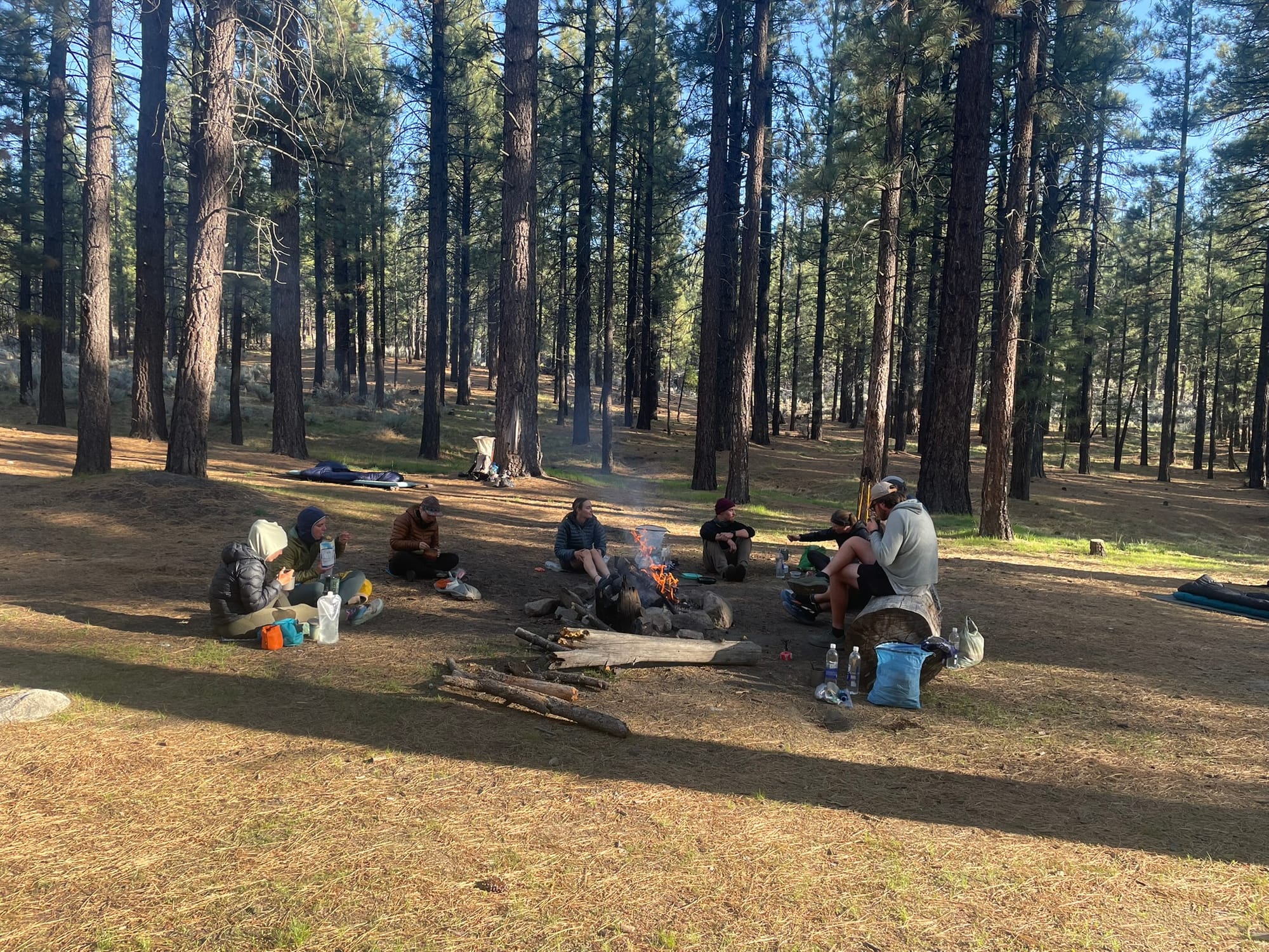 After lunch, we spotted a large turkey and then heard some fighter jets whipping by overhead. In a little valley, we passed a weird 10 commandments sign in the middle of nowhere before passing a weird cabin. Tired of walking in mud, blowdowns, and snow, Anna and I switched it up by walking a forest service road for a few miles that paralleled the trail. Along the way, we saw a ton of hilarious fake radiation warning signs right next to trespassers will be shot signs on the edge of someone’s property. At the end of the road walk, we ran into Twig, whom we had not seen since breaking camp. She regaled us with the story of a cow charging her near a spring a few miles back, and we showed her pictures of the signs. We then walked on together, and the weather thankfully finally cleared out just in time for us to walk into a gorgeous pine forest. We continued on for a bit longer before stopping off at Landers Meadow Camp for the night at mile 610.1. All in, we had done about 23 miles with a good amount of elevation. Once set up, we had dinner around a fire with the Aussies, Twig, Steady, and the group of girls we had camped with in Green Valley.