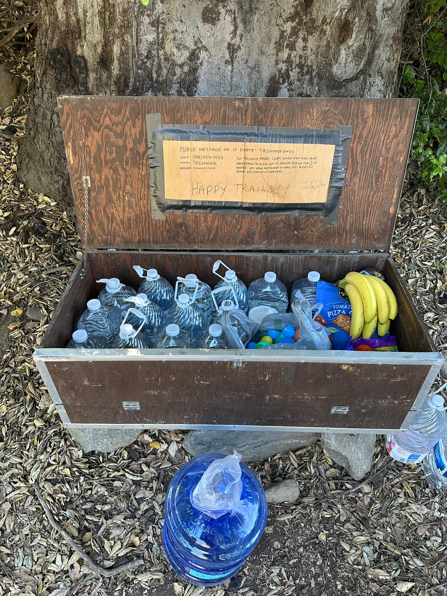 Right after we sat down, the Aussies rolled in, and almost immediately after that, trail angel Tazz arrived to refill the water and to gift us a hot pizza! We helped her with the water, ate as much of the pizza as we could, and then started up our second long climb, now in full sun, a bit after noon. The climb was incredibly hot, and we kept leapfrogging with the Aussies as we each took breaks. Once we crested the climb, the rest of the trail was a long, meandering ridgeline totally exposed to the western sun. Occasionally, we would dip into dried up stream beds, but they were all overgrown with poison oak, poison ivy, and poodle dog bush. We were as careful as we could be in those sections, but fingers crossed, we don’t start itching this evening. The trail continued to meander aimlessly, and it felt like we were walking in circles until we finally saw the road below. We made short work of the remaining distance, crossed the sketchy San Francisquito Valley road, and arrived at our destination for the night, the Green Valley Fire Station at mile 478.2.