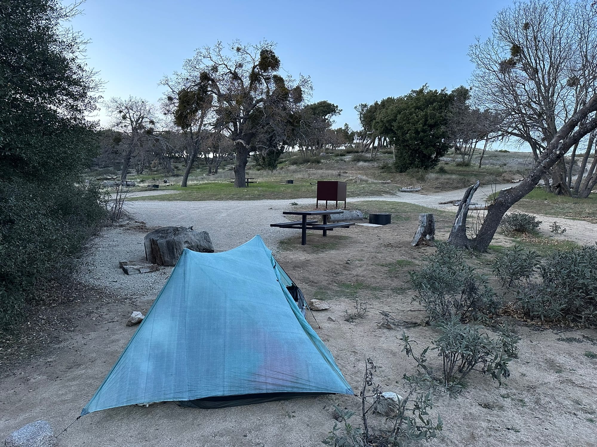 We had done around 14 miles by 11am, and man, was I feeling it. While we were filtering water, the Aussies showed up and we swapped tales on our different night experiences and Tehechapi plans. They then hit the trail ahead of us and followed along a bit after. Twig caught up with us, grabbed our phone numbers, and then sped on ahead since she had her own plans for town, and by this point, we were really dragging. The first canyon rim walks were pretty easy going despite the dirt bike erosion, but then we made it to the real climb of the day. The climb started in a shadeless canyon immediately following a steep downhill. We then went up about 1700ft on a slightly eroded sandy trail over the course of s few miles. Since we were both dead, we slowed our pace and took it nice and easy. Along the way up we took a break in the only nearby shade with a lovely hiker named Guac. After we had had enough carbs and electrolytes, we forced our way up the last bit and eventually ran into another secret cache, complete with a chair and a giant umbrella. We stopped to have a quick swig of water and to chat with the other hikers before again setting out. The sun was still glaring down on us, and we were cooked, so we called it early around 4pm and set up camp around mile 551 to take advantage of the cooler elevation. With our early stop, we were able to book a room in Tehachapi and mail some much needed shoe replacements ahead of us. All in all, we’re a bit fried from another big day of distance and climbing!