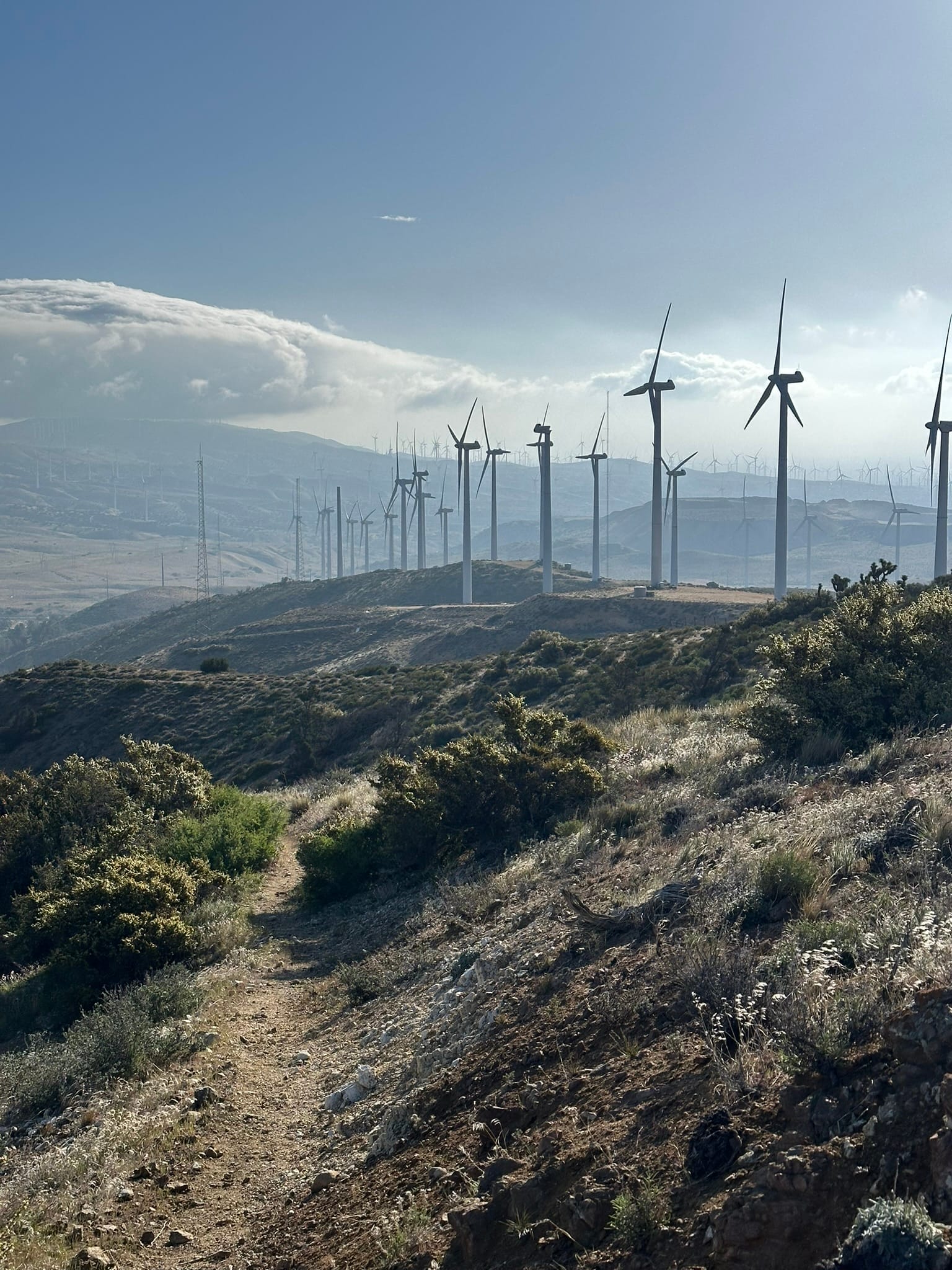 Anna and I slept in a bit since we knew we had an easy walk into town and a zero the next day. We woke up to a sea of clouds under our tent and perfect weather. We easily glided the few miles into town, stopping only to admire the beautiful morning light on the windmills. Along the way, we saw one racer snake but zero hikers. Down at the road, we had to wait for a bit for a hitch, but eventually, a wonderful guy named Jeremy pulled over in his converted minivan. Jeremy was an older thru-hiker who had previously bagged the triple crown in the early 2000s, and he was now living in New Mexico with his wife, but he was currently boondocking around California to hit up his favorite hikes. Once in town, Jeremy took us to the diner we had requested for breakfast, and with a little bit of pestering, he agreed to have breakfast with us. Over breakfast, we chatted about the trail and the social difficulties of life outside of the trail before splitting our separate ways.
