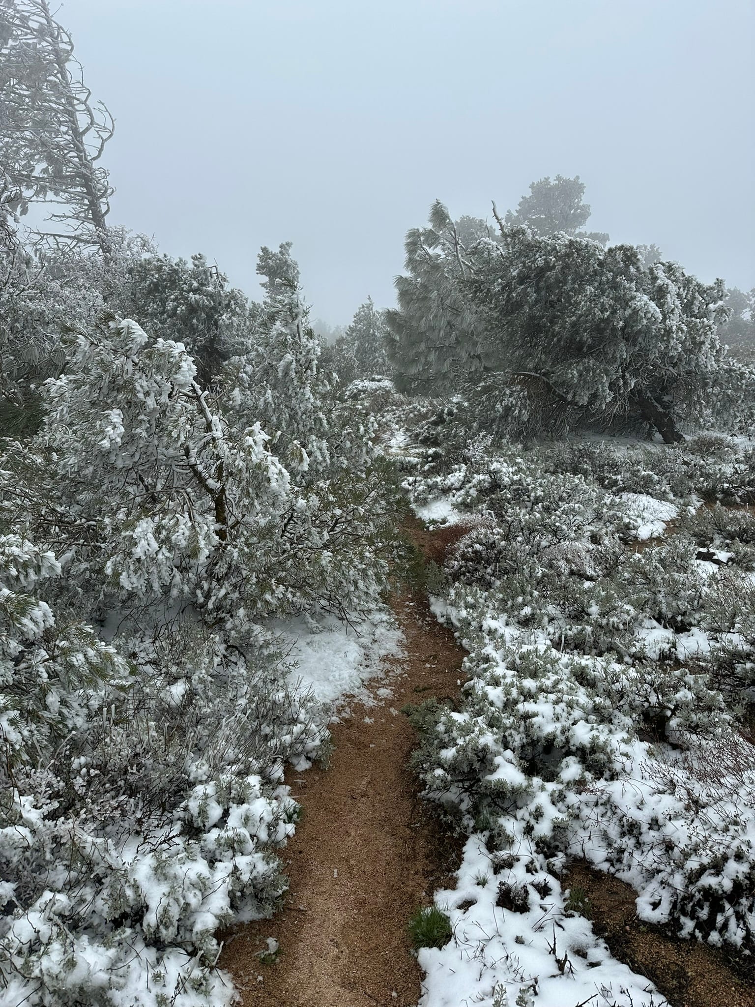 After we had eaten our fill, we headed back to our rooms to pack to make a 9:30am appointment with a trail angel. Unfortunately, that plan almost immediately fell through, so Anna expertly guided us to plan 2, the bus stop. Amazingly, the Kern County bus arrived right on time, and the driver was more than happy to accommodate us with the special PCT stop. He even worked with the other passengers to help us make exact change for everyone. What a guy! Back on the trail, we hiked next to Highway 58 for a while and got a few friendly honks from passing drivers. The weather was honestly perfect, and I was able to keep my fleece on for the first chunk of the gently graded climb. As always, though, I became too warm from the effort and packed away my warm layers. We continued until one point where we rounded a bend and just about got blown off the trail by the powerful, cold wind. Anna and I continued to press on as it quickly became colder and snowier around us. I was trying to dry my sweat out before re-layering up, but I ended up getting too cold and having to stop. We pressed on, though, and made it to the top.