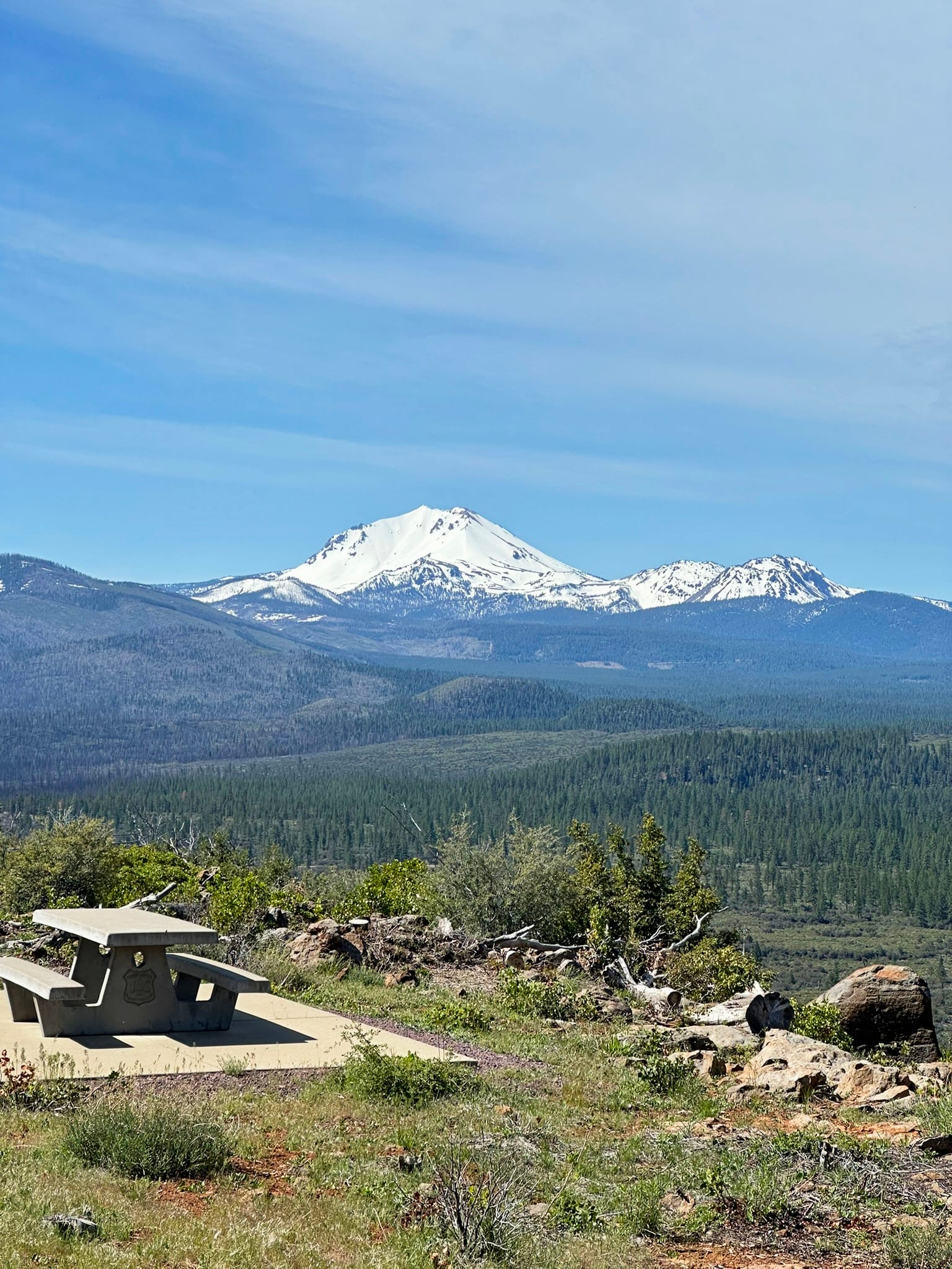 From the boundary sign on, the trail was completely snow free and easygoing. We passed through another large burn scar remnant of the Dixie Fire before descending into a dense pine forest, filled with blooming manzanitas. From there, we continued on the dusty pine duff trail until we arrived at Hat Creek Resort, where we stopped in for ice cream and to dry our tent. A local monk chatted with us about the trail for a bit and expressed that he wanted his monastery to host hikers this season! We then packed up and hiked the remaining few miles into Old Station at mile 1378.8, where we set up for the night behind the Old Station Fill Up. The new owner of JJ’s Cafe gave us the lowdown on showers and laundry, so we finally washed up and enjoyed hot food from the store. Despite being pretty cooked from yesterday, we still clocked a little over 20 miles today! That being said, we’re probably sleeping in tomorrow for pancakes!