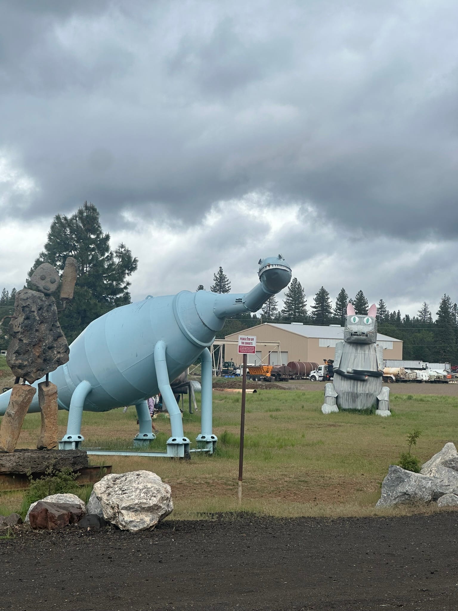 The wind kept up most of the night, only tapering slightly in the early morning, but also being accompanied by slightly warmer, more humid air. Between the warmer temperature and my deflating pad, I slept terribly. Since we were expecting rain, we woke up a bit earlier than normal to try and beat the rain. Unfortunately, though, it hit us early while we were packing up, soaking some of our gear. Tragically, while we were packing the tent, the second zipper door failed as well, rendering both of our doors inoperable… Anna and Imi still had a few things to pack up, and I’ve always been the slowest of our little crew, so they sent me on ahead to start hiking. I was pretty sleepy and my stomach hurt, so I sort of just zoned out in the rain for a while. I passed a few random cows, and the rain picked up, and at some point, I realized that the girls should have caught up to me by now. We had discussed potentially road walking if the weather was bad, so I tried to fire off a text in the rain, but couldn’t get the touchscreen to work. I pulled an audible and headed towards the road. Eventually, I was able to get a text through, and the rain let up, so I put an earphone in and picked up my pace. After a mile or so, Anna called me, and apparently, they were a mile ahead of me, so I hurried along. Now all together, we road walked into the town of Cassel since the trail was a muddy mess. Along the way, we passed a very unique sculpture garden of various figures made of welded scrap metal. We took a bit of time to check it out before heading down to Highway 299, where we quickly got a hitch into Burney by a local named Debbie.