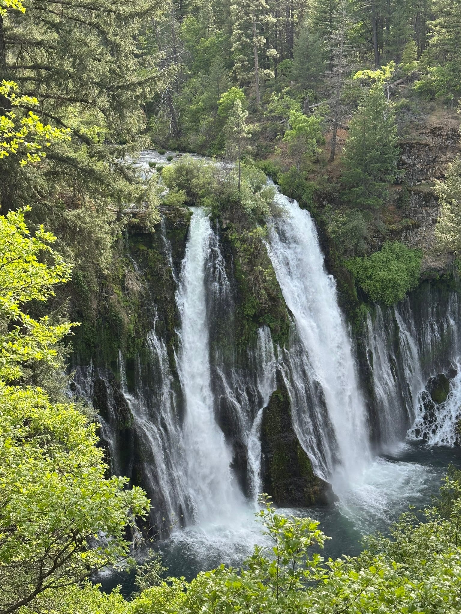 By this time, we had run out of things to do, so we went and sat on the ski lift chair in front of the gear shop before they opened, and 20 minutes early, one of their employees graciously let us in! I was able to grab the exact replacement sleeping pad I wanted, along with a Big Agnes Tiger Wall Platinum UL2 to replace our broken beloved Durston Xmid 2 Pro. Since we had been able to get into the store early, we were easily able to catch the 10:20am bus back to Burney! After another 2 hours of half asleep nausea, we made it back to the church gym and chatted with Imi for a bit. She kindly offered to grab us sandwiches while we tested our new gear to make sure it all worked. After our delicious lunch of Subway, I packed up the Durston and my leaking pad and mailed them home to be repaired or warrantied at a later date. Finally ready to go, we said our goodbyes to John, our gracious host at Word of Life, grabbed a ride from trail angel Dennis, and hit the trail. As soon as we hopped on the trail, it started to rain, but thankfully it petered out after 15 minutes, and we had a blissful, cruisy 8 miles through gorgeous forest to arrive at our goal for the evening, Burney Falls State Park. The 2 bridges we crossed, Burney Creek and the falls, were all incredibly pretty, and we had a wonderful spot tucked away in the pines. I’m glad today went so well, and I’m stoked to finally get a good night of sleep for once!