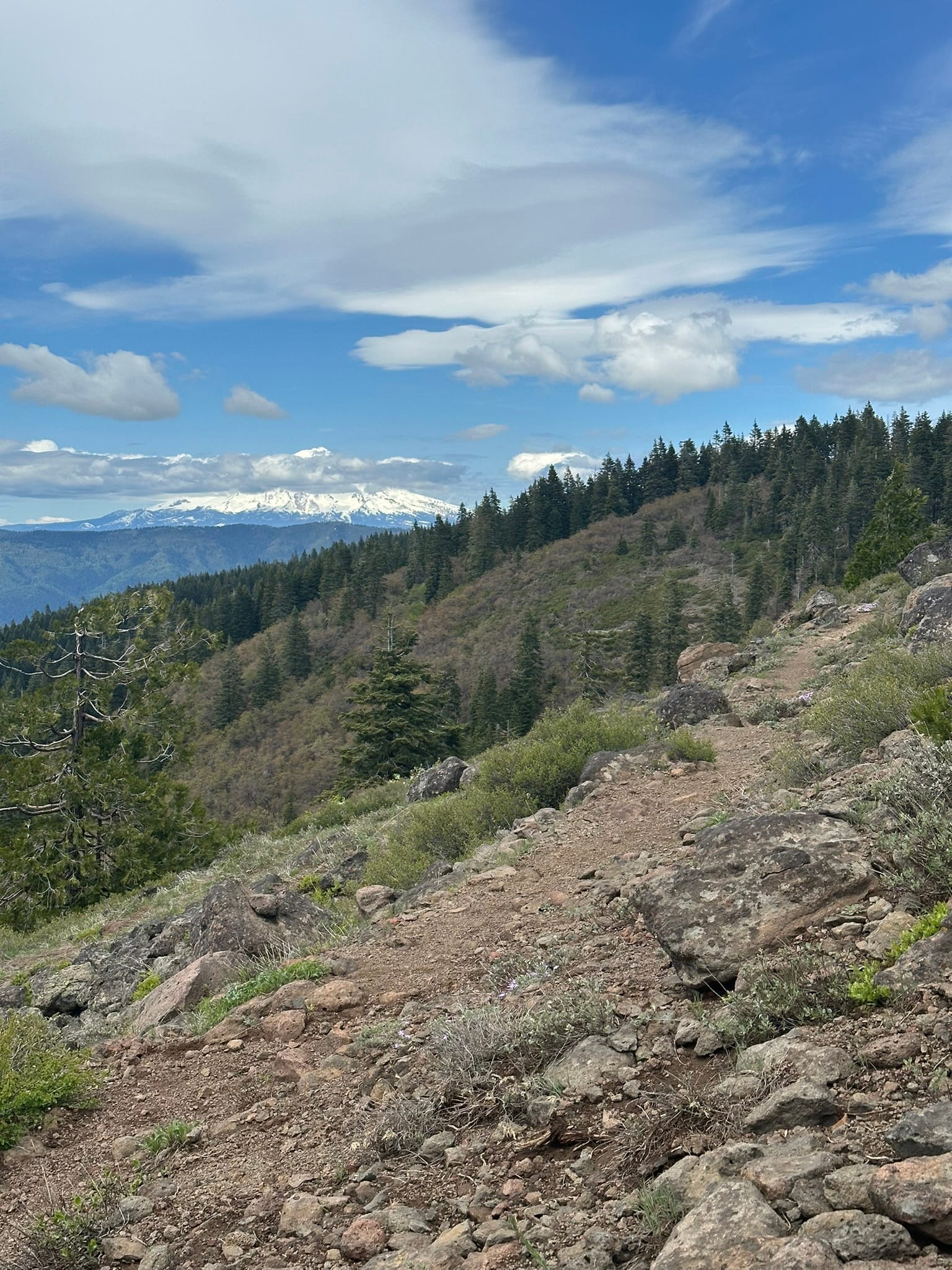 I awoke suddenly around 5am to my glasses falling and Anna shining her light around the tent. Apparently, her coffee bag had exploded, and instant coffee was all over the “new” tent. She was able to contain the mess for the most part, and now our tent refreshingly smells like coffee (and feet)… We then packed up quickly and quietly, eager to finally get some mileage done this morning. Since Imi is a faster hiker than us, she was sleeping in today, so we tip-toed out of our campsite, saw a bunch of bats flying out of the privy, and hit the trail. Unlike most of this section, the trail was incredibly flat and easy going. We were able to easily knock out the first 8 miles (and our first climb of 1800ft) before 9am. On the way up, we saw a massive moth and a large Shasta Alligator Lizard. Once at the top, we stopped for breakfast and had Imi pass us by. Along the way downhill, we encountered a bunch of blowdowns, and while I was stepping over one, the edge of the trail gave way, causing me to fall and slam my shin into the tree with my full weight. Thankfully, I was able to catch the tree, so I didn’t slide down the slope, but man, does my leg hurt, even now as I’m writing this. I carefully hobbled on it for a bit until the sharp pain turned into a dull throbbing, and we continued.