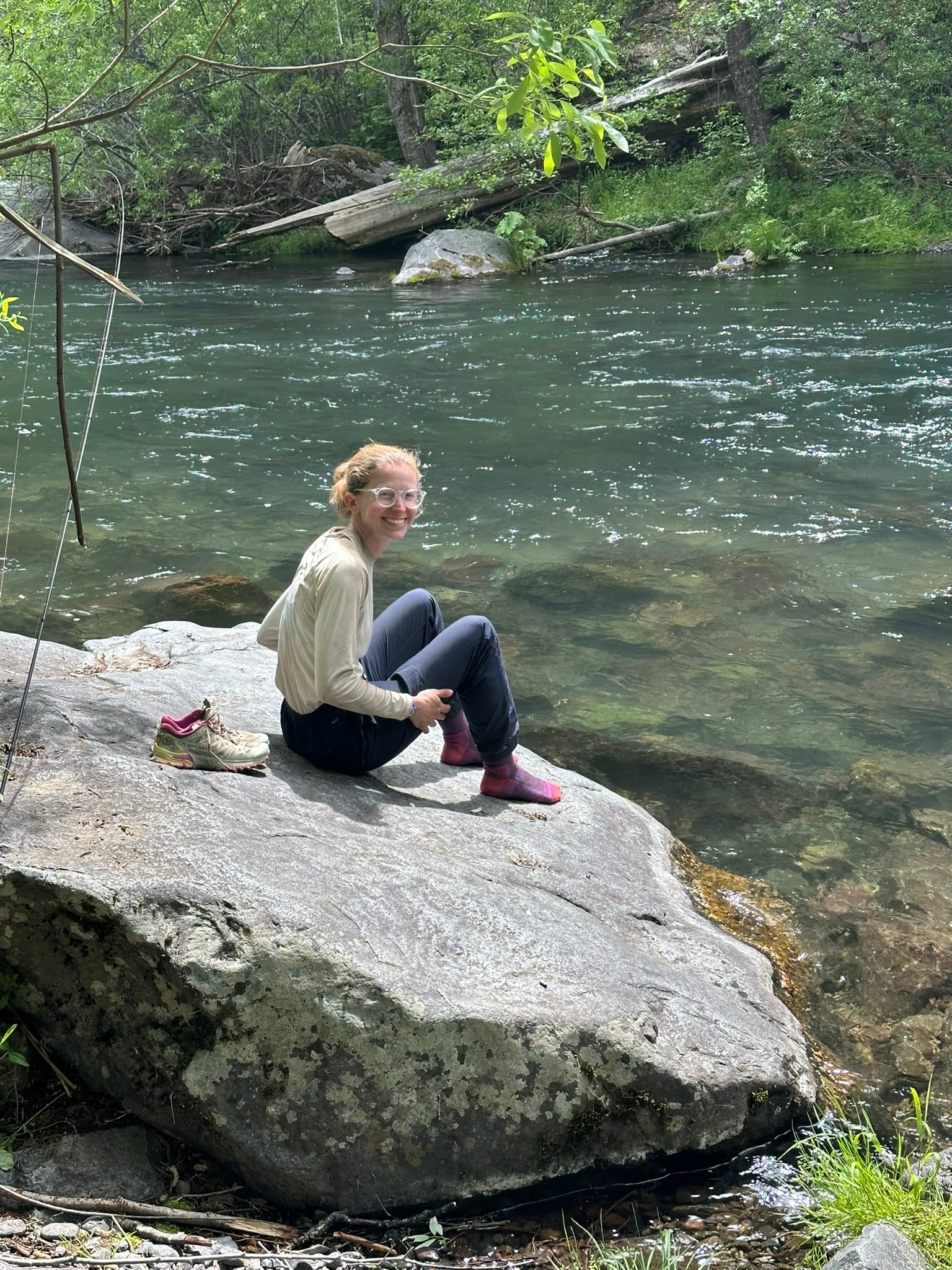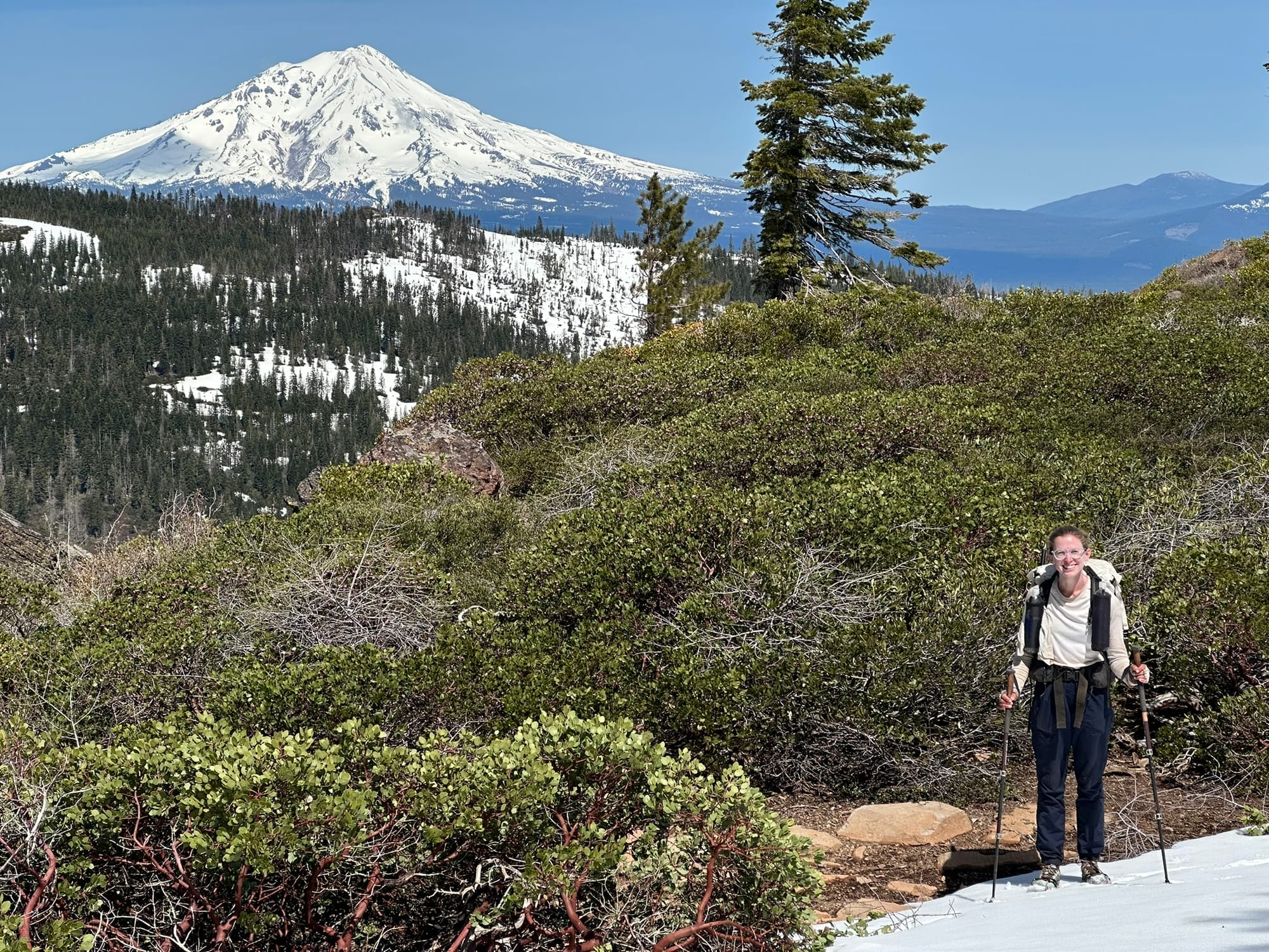 After the falls, we hit our big 2600ft climb up and on the way passed Gravity and Freefall, whom we had reunited with at the church in town. They had slept in an amazing grove of older pines and had decided to sleep in late. After we chatted for a bit, we continued on up, enjoying the gorgeous forest around us. We had been worried about hitting snow based on previous FarOut comments, but all we found were a few annoying blowdowns. Finally, at the top, we stopped for lunch and to enjoy the incredible view from the top. We could see large snowy peaks far off in the distance, and Mount Shasta suddenly looming up close. After lunch, we continued on across the ridge and quickly hit our first snowfield, miles after where the last comment said it started. Along the snow, we noticed two sets of sizable bear prints, but otherwise nothing of note. The trail became increasingly overgrown and covered in pollen, so Anna and I took our chances with a forest road while Imi continued on the trail. Maybe a quarter mile in, our road ended abruptly, so Anna and I trudged through the snow back to the trail in an effort to catch Imi. The rest of the 7 miles of the 24.3 we did in total ended up taking from 12:30pm to 7pm due to the snow, blowdowns from shoddy logging, and overgrown trail. Annoyingly, all of the plants we rubbed up against were also coated in thick layers of pollen and dust from logging, so we quickly became coated in the stuff. Notably, we did see a shrew-like creature near a watering hole, but nothing else exciting until we found Imi and ended our 13 hour day at mile 1444.6. Hopeful the trail improves a bit tomorrow and we can return to forest cruising.