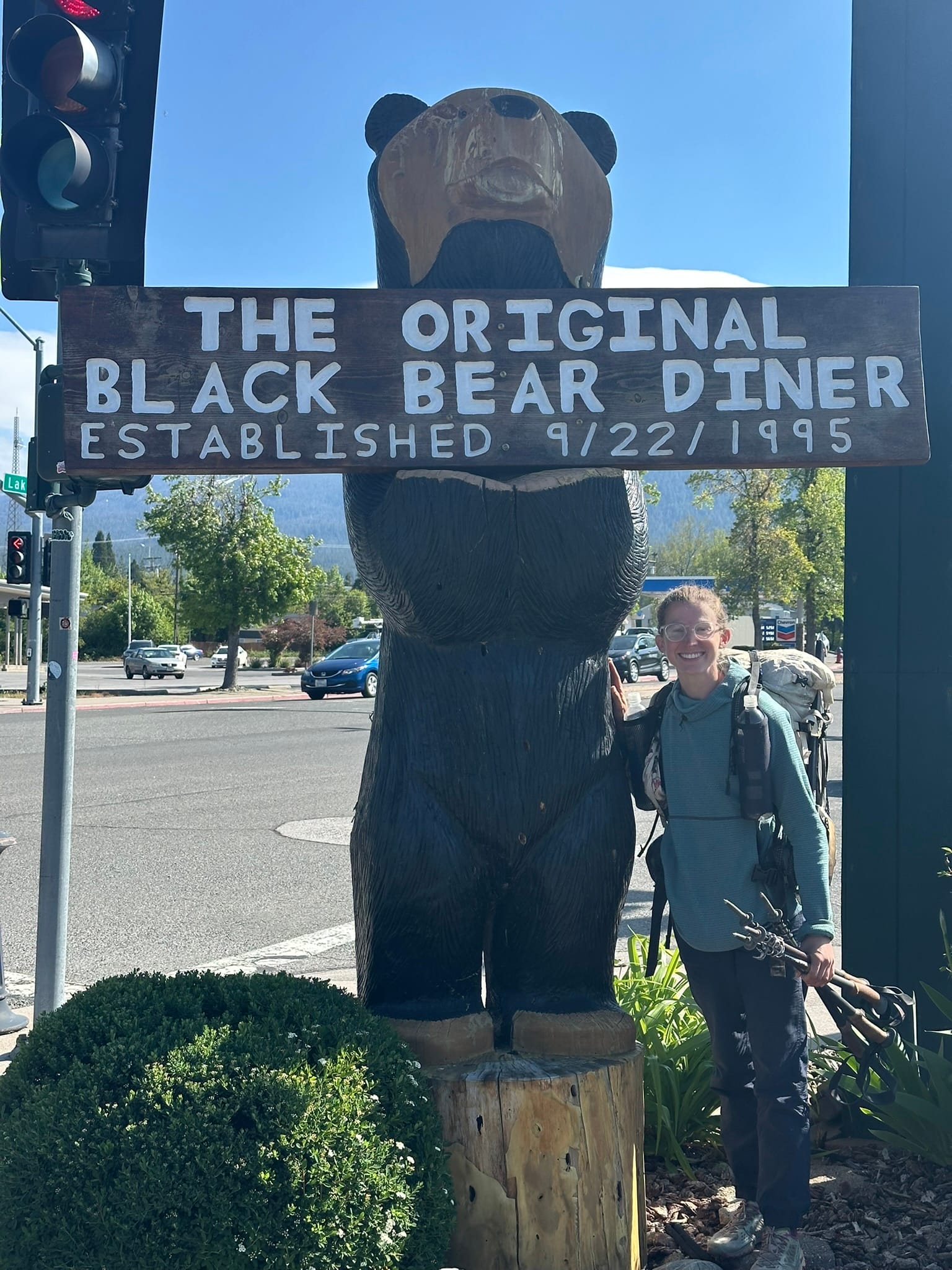 Eager for town and hoping to see some bears, we left camp at 6am, which is now bright and sunny due to the long days. The trail was friendly, with few blowdowns, and a soft pine duff covering. Unfortunately, I never got my early morning shot of Castle Crags, but we did have a fantastic walk through a forest full of more old growth and second growth. We quickly covered the 6 miles in a few hours and coasted up to the trail tracks before the on ramp for I5 at mile 1502.7. There, we realized that it would be pretty much impossible to hitch due to the lack of traffic, so on a whim, Anna called local trail angel “Doc” from a comment she found on FarOut. He promptly responded and, in no time at all, whipped up and gave us a free ride into the town of Mt. Shasta. Along the way, he cruised through Main Street and told us where everything was and which places to ignore. He then dropped us off at the Black Bear Diner, where we had scored free breakfasts, again from an old FarOut comment Anna had found. Fat and happy, we headed over to the Cold Creek Inn, where I got us a discounted hiker rate for the night. While we waited for our room to be ready, we changed into our rain gear and washed our clothes. While doing laundry, the owner, Michael, came by and chatted with us for a while. I’m still not sure, but I believe that he ended up upgrading us to a two bedroom room afterwards! We gained access to our room a bit after noon, and I promptly hit the showers to scrub all of the mud off from the previous section.